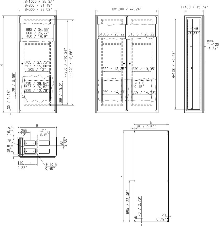 Entrée de câble : en bas avec 4 plaques d’entrées de câbles montées à fleur à l’extérieur, vissées de l’intérieur.