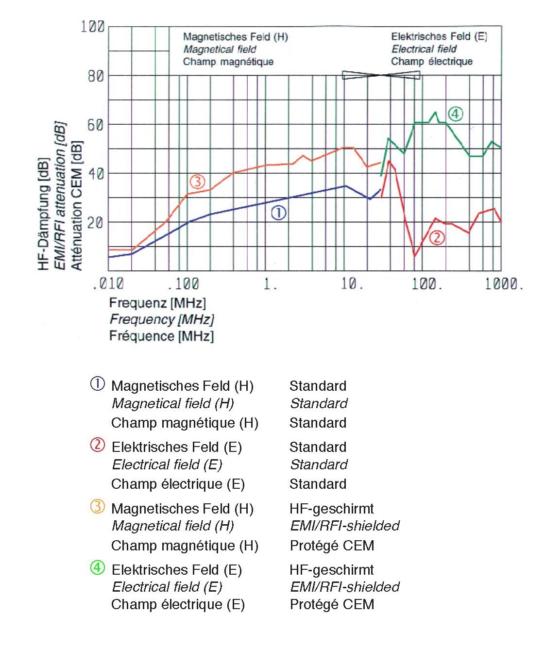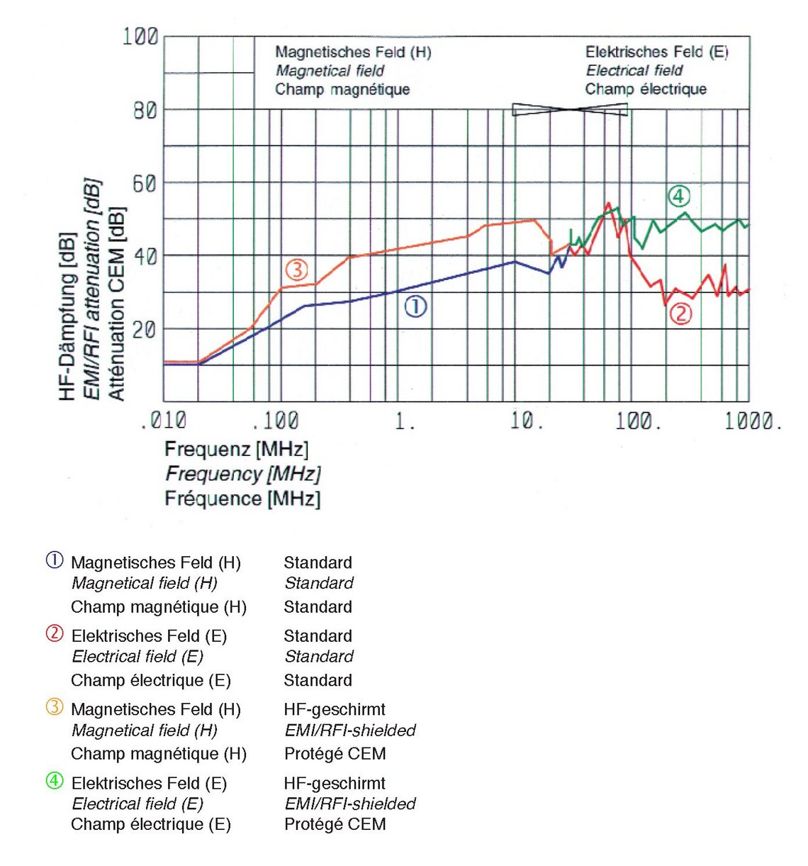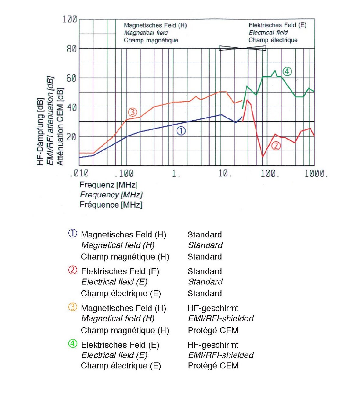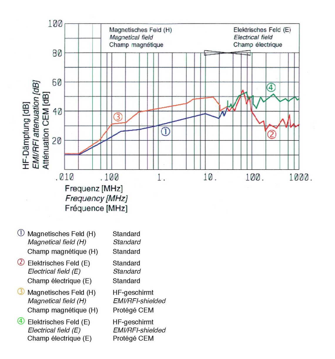 Grâce au joint spécial CEM/IP et à d'autres mesures, nous augmentons le blindage pour vous. L'atténuation du blindage a été mesurée sur des coffrets fermés par un institut indépendant conformément aux normes VG 95373, partie 15 et VG 95370, partie 15, et sert de guide pour le choix des coffrets.